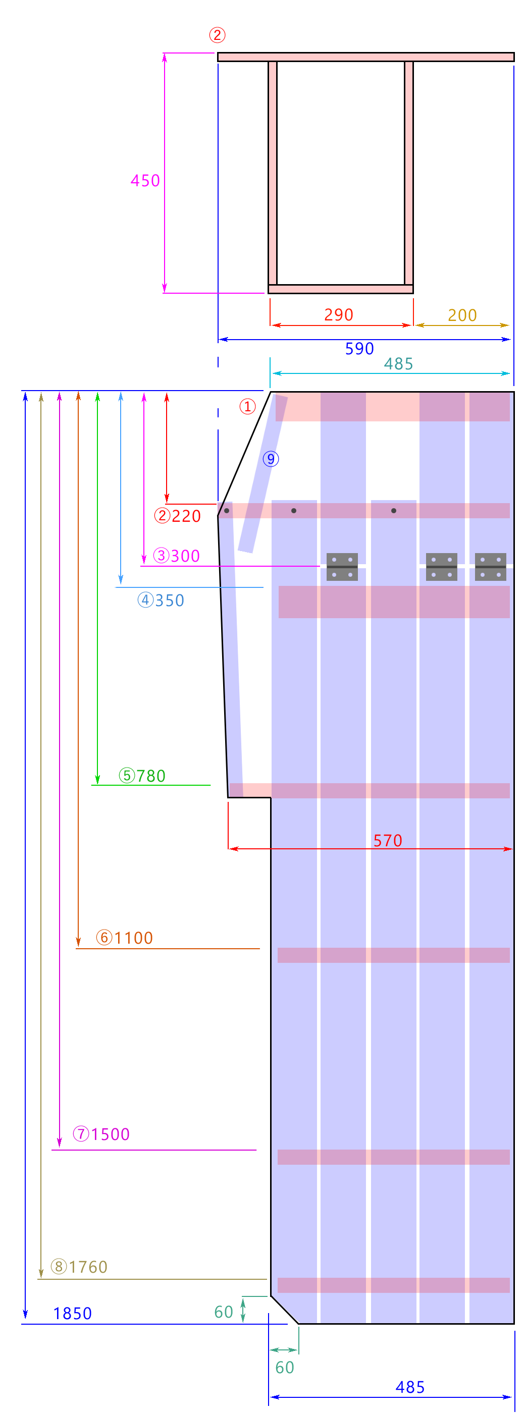 赤透明が横板。@以外は縦板の裏面に付く。