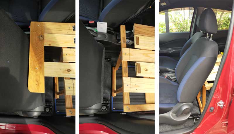 助手席側に設置する想定。助手席を最前に、背もたれを前屈に。